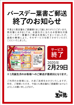 バースデー葉書ご郵送 終了のお知らせ